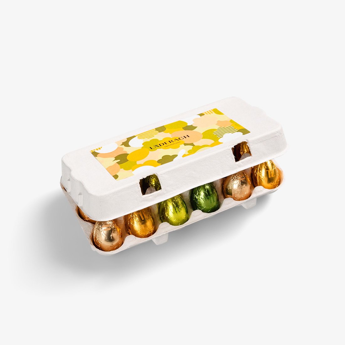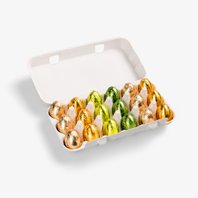 Easter eggs gift box filled with 18 foiled eggs. Each box contains 6 milk chocolate eggs, 6 hazelnut eggs, 3 dark chocolate eggs, and 3 white chocolate eggs.