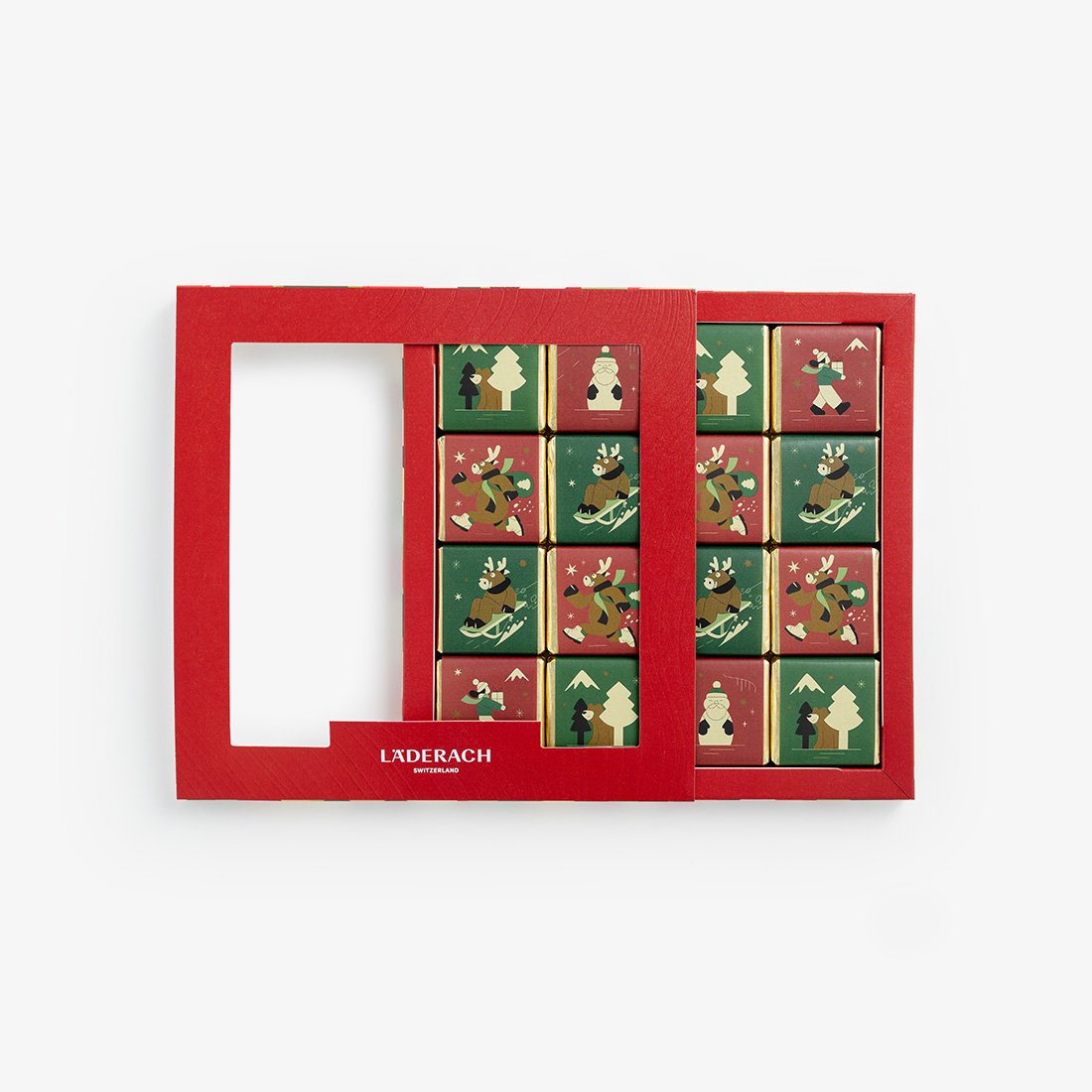 Festive box with 16 milk chocolate suqares, individually wrapped with different illustrations of Reindeer Finn (110g).