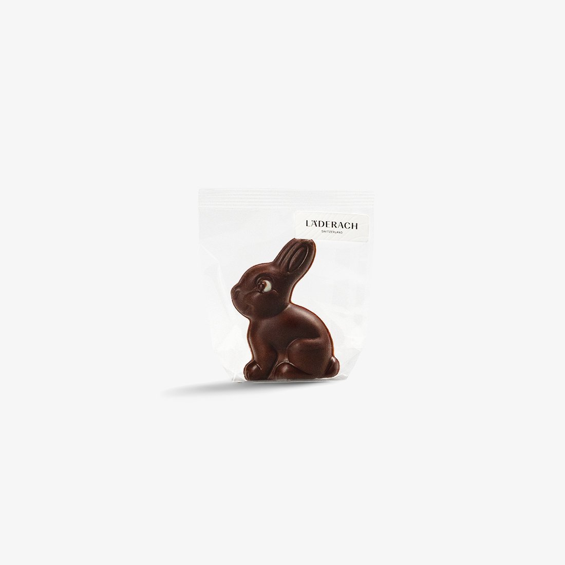 An adorable easter bunny crafted out of dark chocolate and studded with caramelised whole hazelnuts.