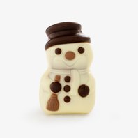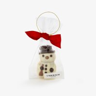 White chocolate snowman filled with delicious hazelnut gianduja. Each chocolate snowman is individually wrapped and attached with a red ribbon.